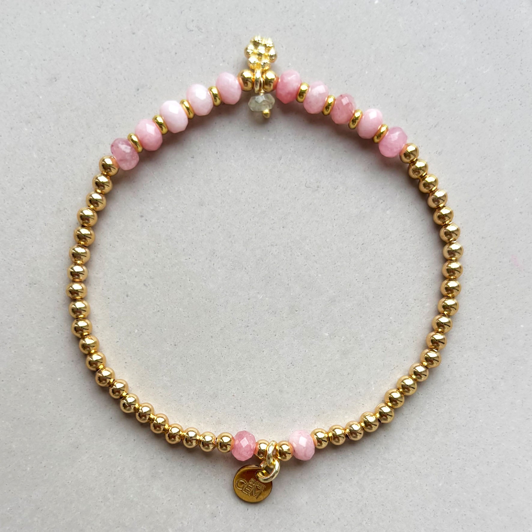 Das Super Gem Armband mit Tourmalin Anhänger besteht aus 3 mm vergoldeten Perlen und linsenförmigen Achaten.