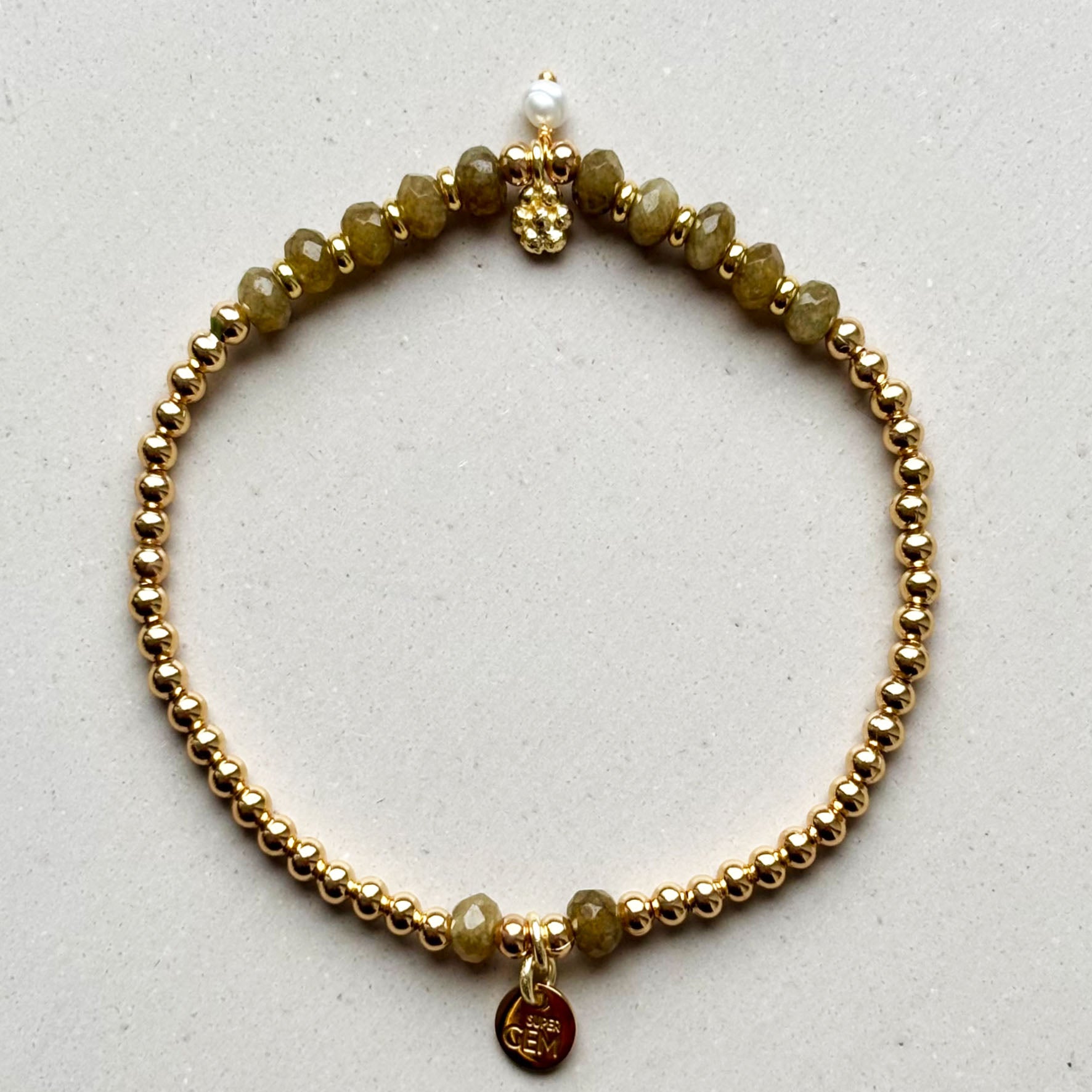 Das Super Gem Armband mit Tourmalin Anhänger besteht aus 3 mm vergoldeten Perlen und linsenförmigen Achaten.