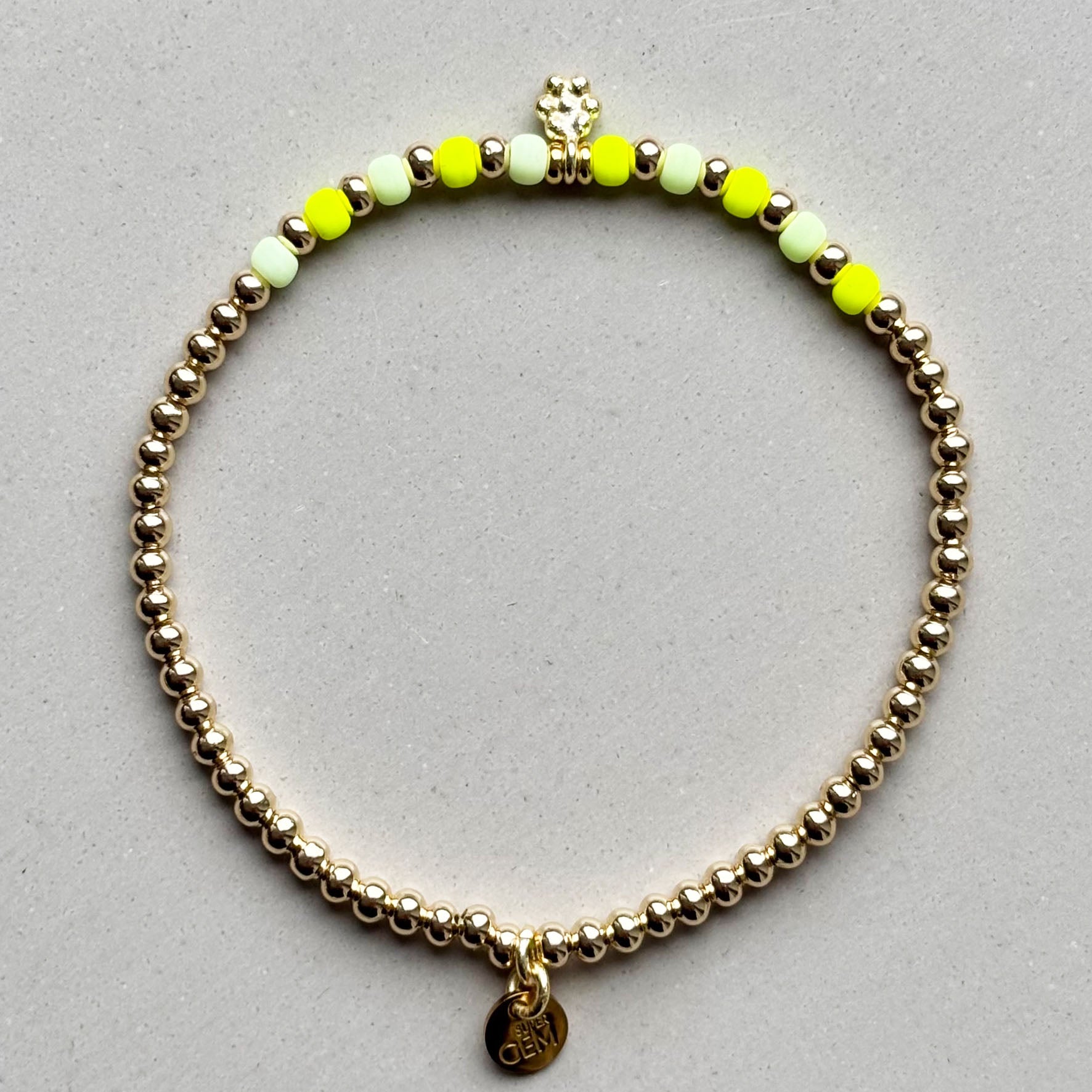Das Super Gem Armband besteht aus 3 mm vergoldeten Perlen und 3 mm Rocaille Glasperlen.