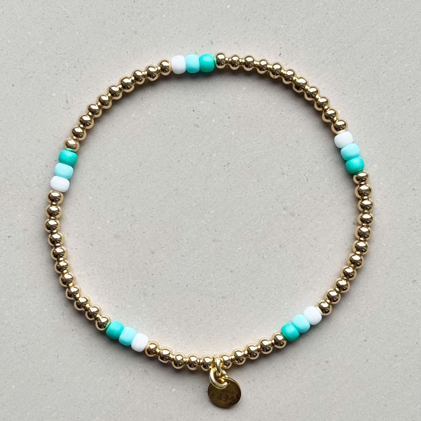 Das Super Gem Armband besteht aus 3 mm vergoldeten Perlen und 3 mm Rocaille Glasperlen.