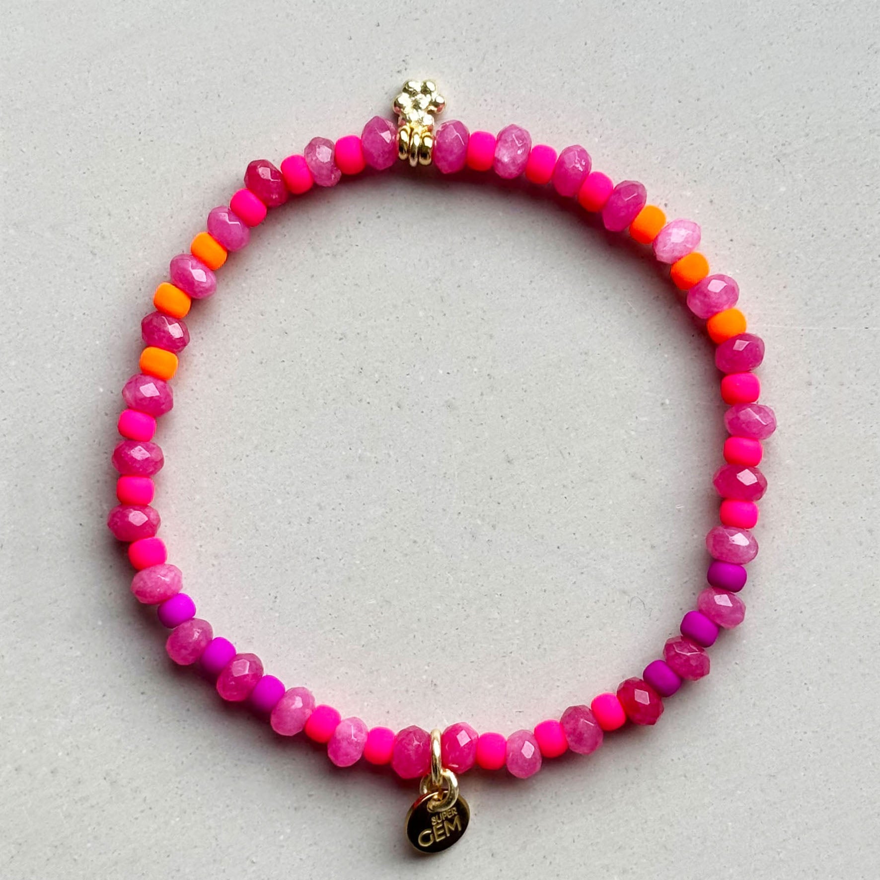 Das Super Gem Armand besteht aus Achat Edelsteinen in Linsenform kombiniert mit 3mm Glasrocailles in einem strahlenden Verlauf, mit vergoldetem Blümchenanhänger als kleines Highlight.