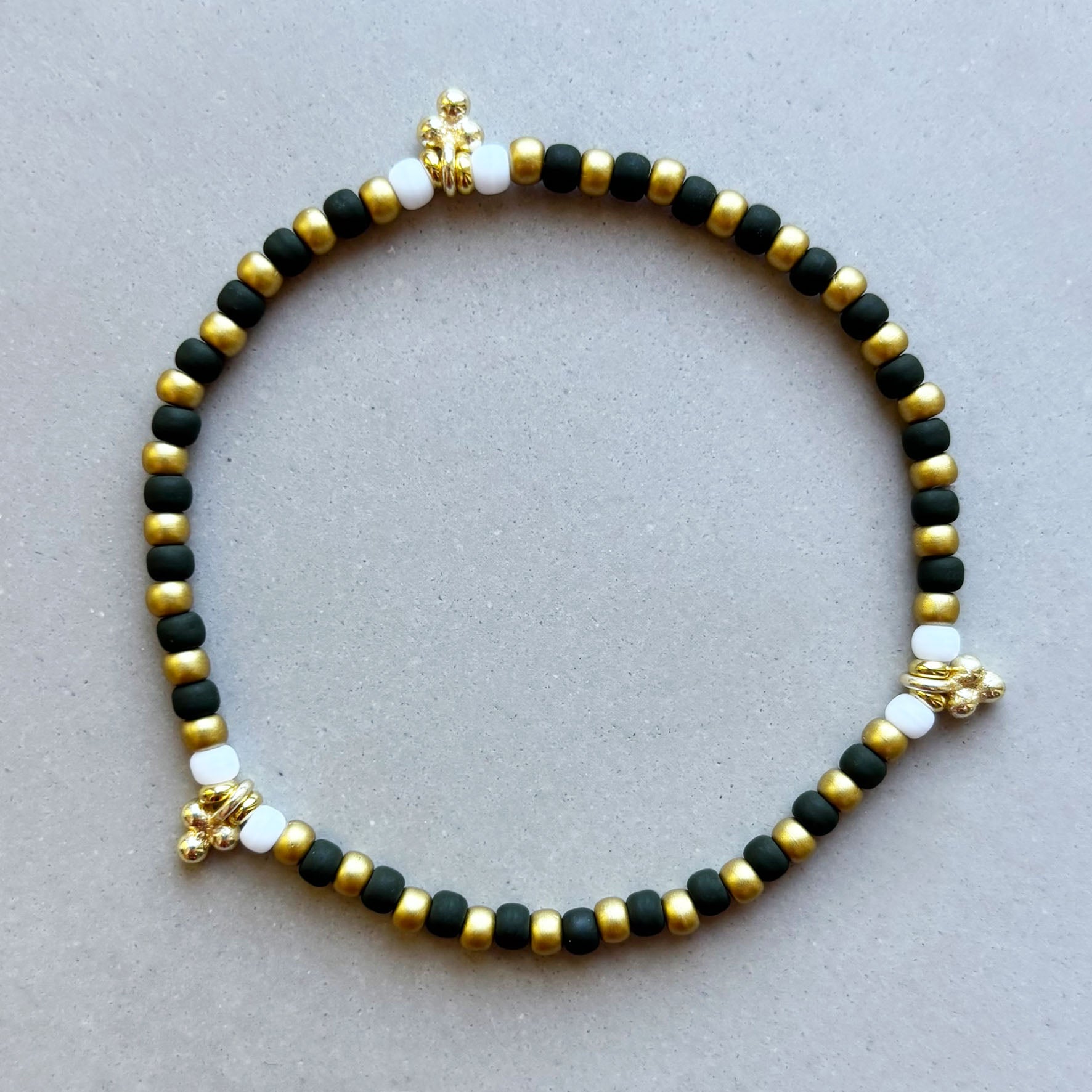 Das Super Gem Armband besteht aus 3 mm Glas-Rocailles Perlen und vergoldeten kleinen Anhängern.