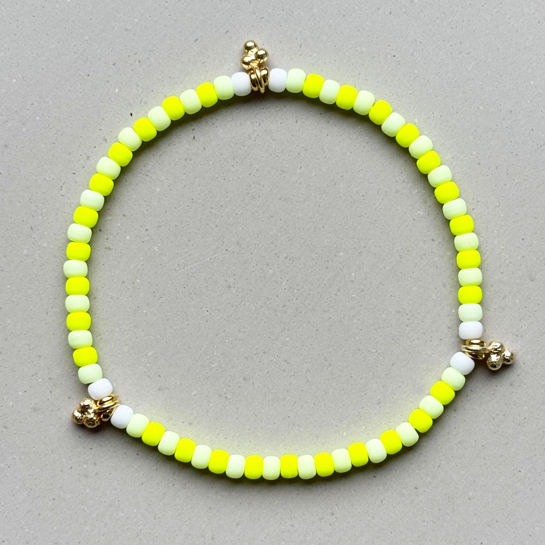 Das Super Gem Armband besteht aus 3 mm Glas-Rocailles Perlen und vergoldeten kleinen Anhängern.