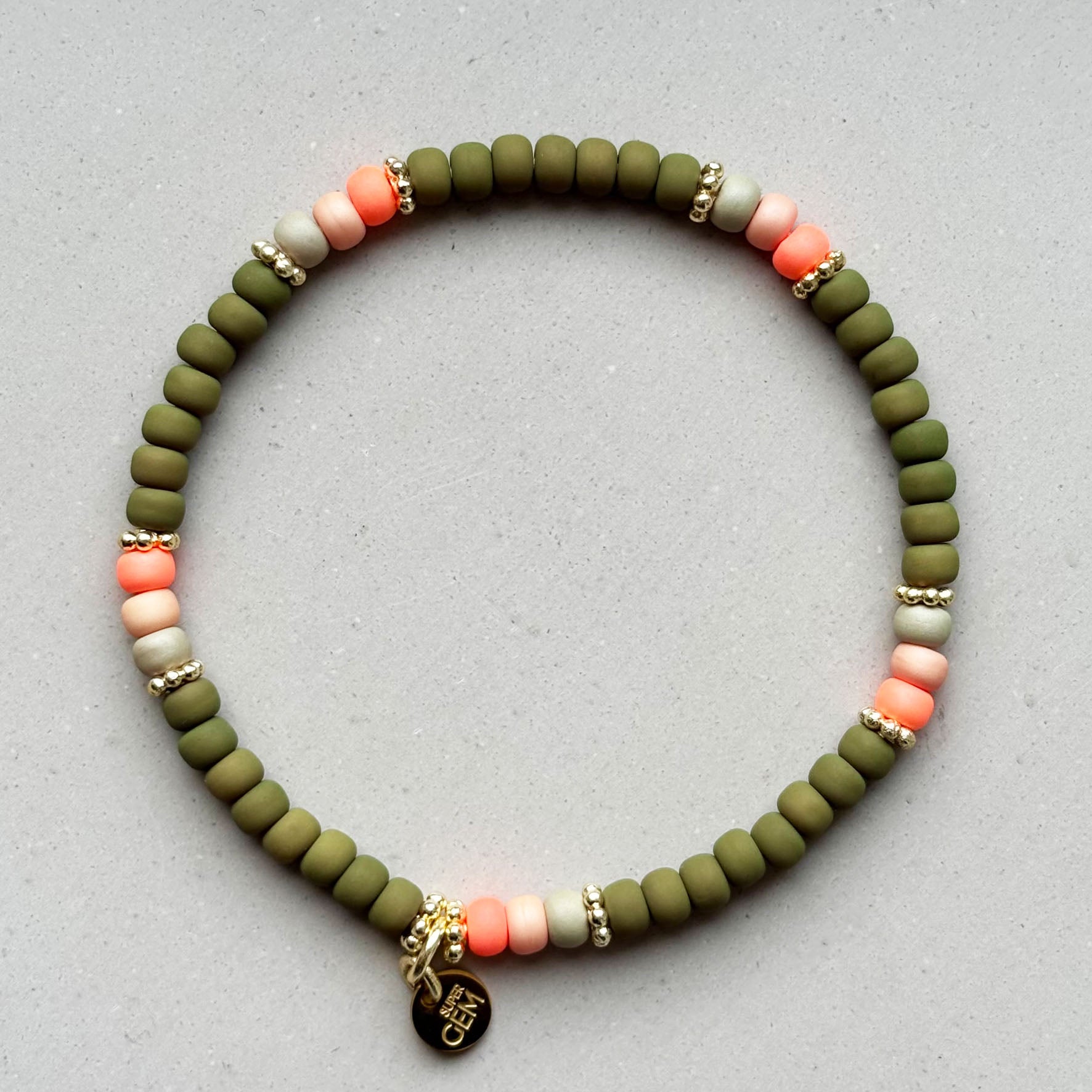 Das Super Gem Armband besteht aus 4 mm Glas-Rocailles Perlen und vergoldeten Spacern.