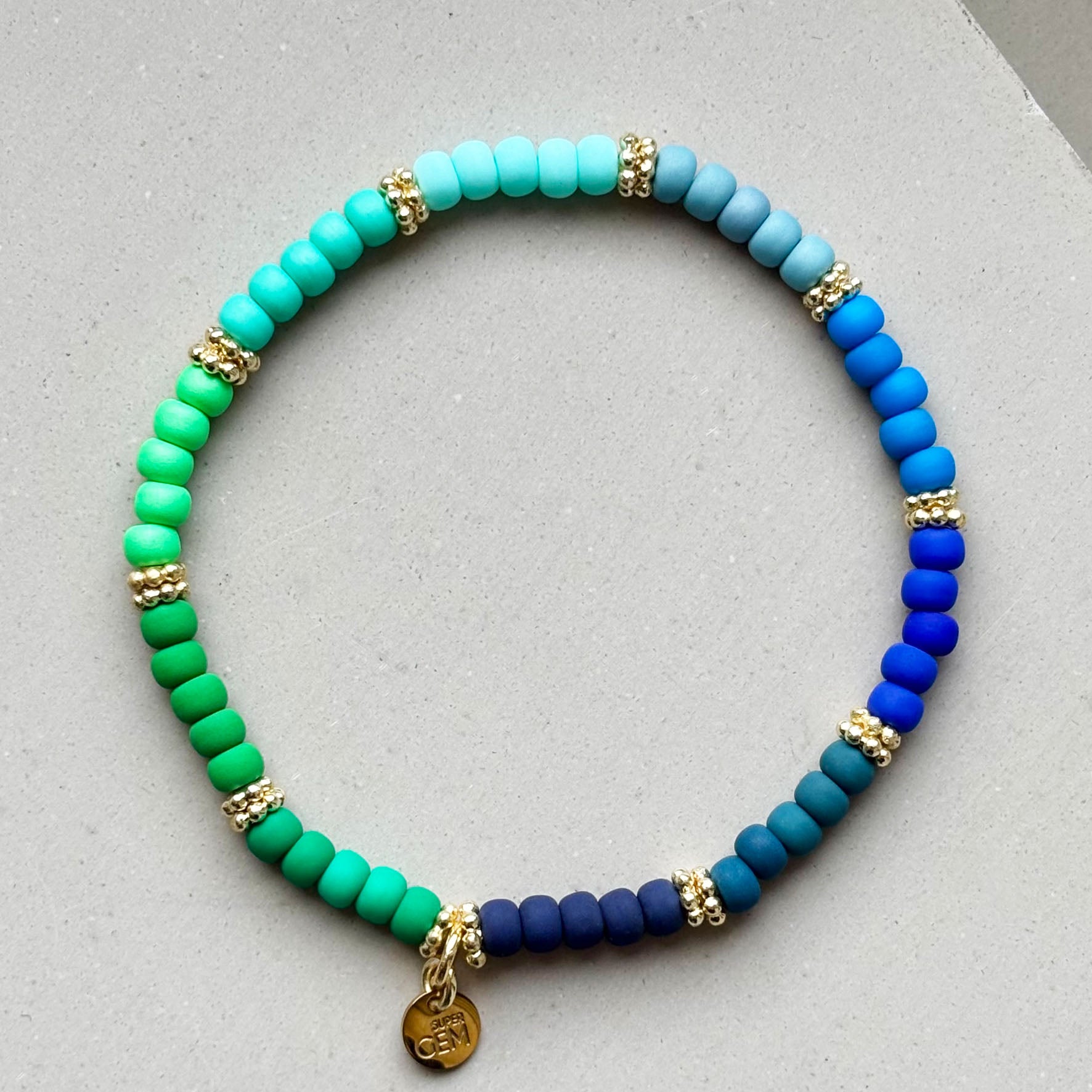 Das Super Gem Armband besteht aus 4 mm Glas-Rocailles Perlen und vergoldeten Spacern.
