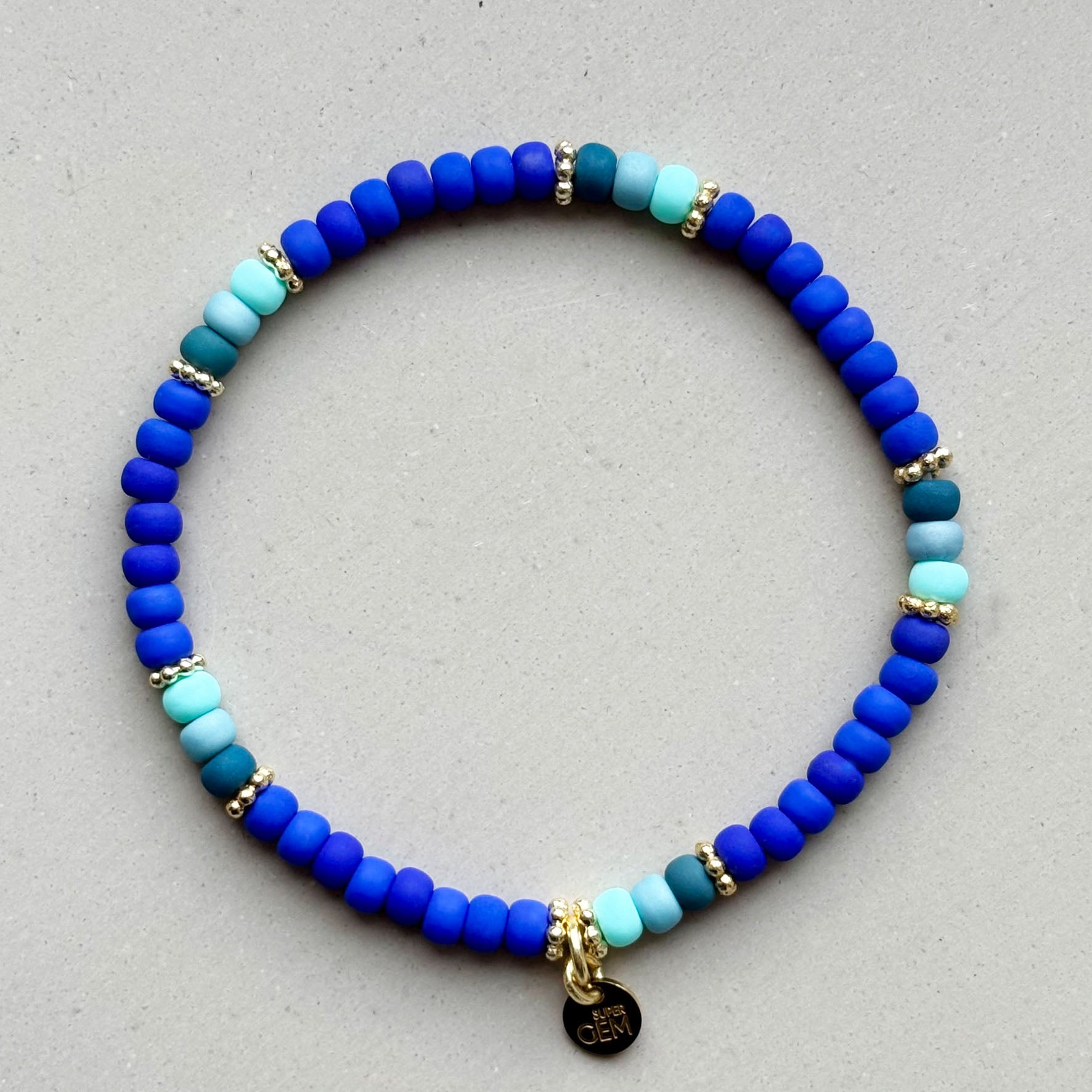 Das Super Gem Armband besteht aus 4 mm Glas-Rocailles Perlen und vergoldeten Spacern.