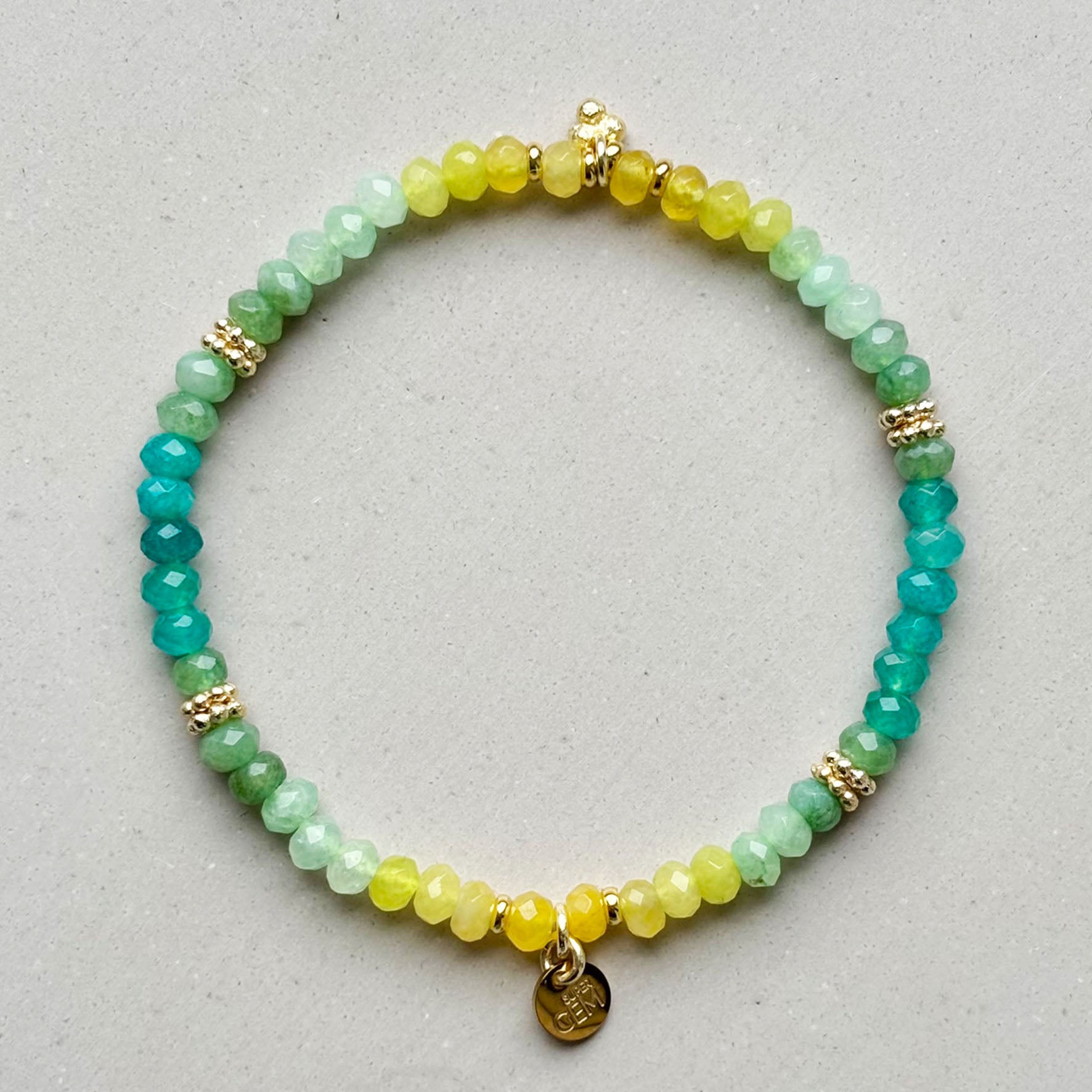 Das Super Gem Armband besteht aus 4 mm geschliffenen Achat Rocaille Perlen und vergoldeten Spacern.